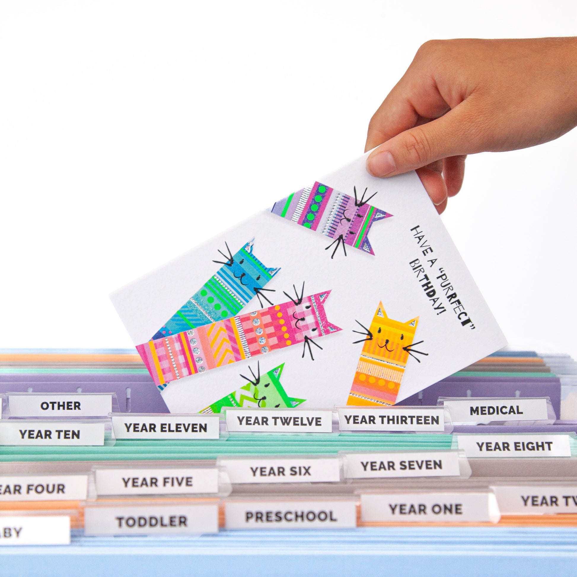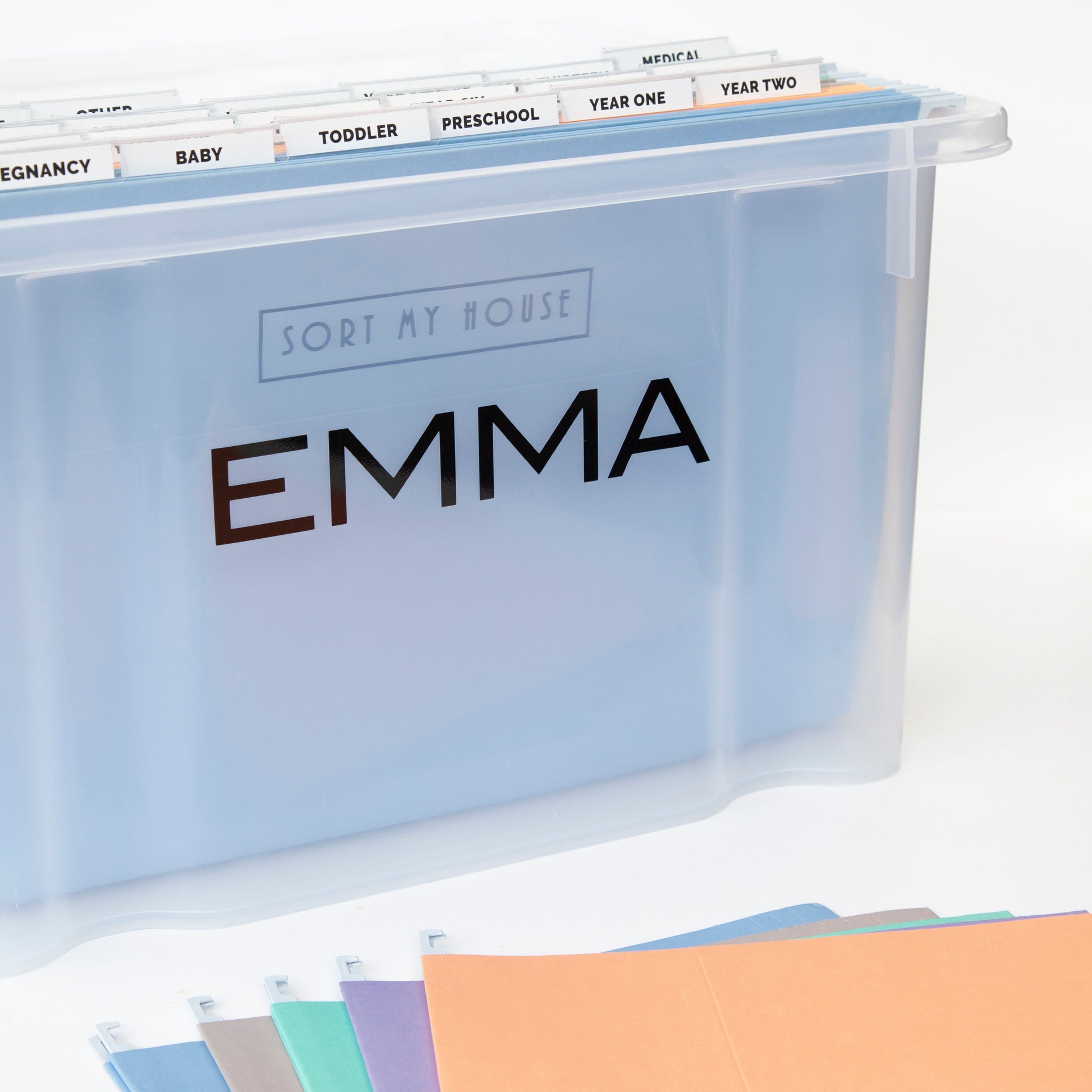 Our personalised document file box is an effective and attractive way to store all your children's paper work. Great for school reports, sports certificates, medical records, childcare information and anything else that you want to keep safe and in one place.
