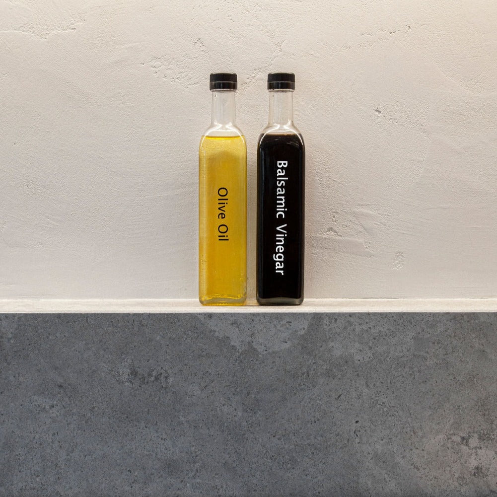 Our labelled glass bottles add the finishing touches to your kitchen organisation. With 2 different bottles sizes of 250ml and 500ml we cater to all your needs. Labels are applied by us, saving you time.