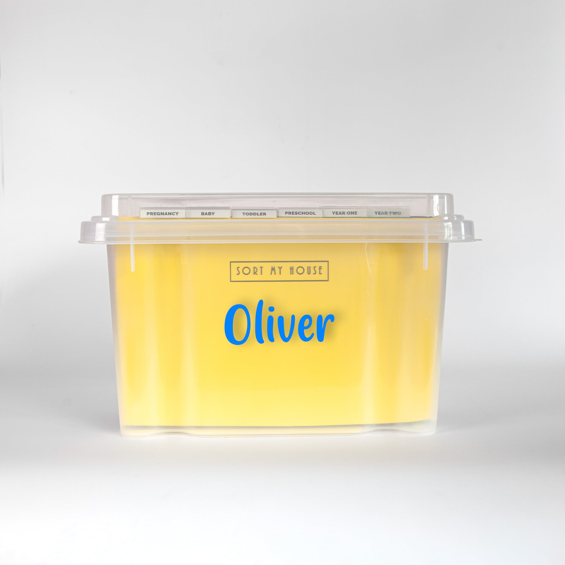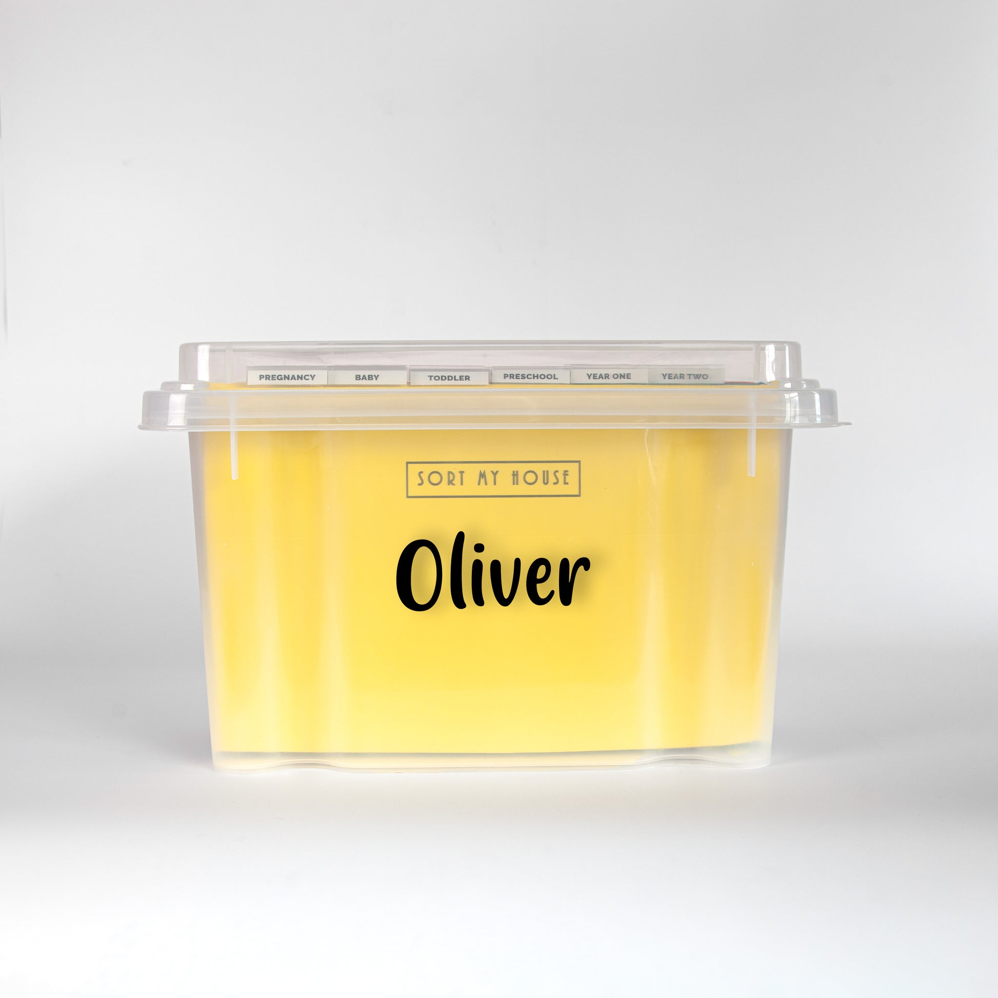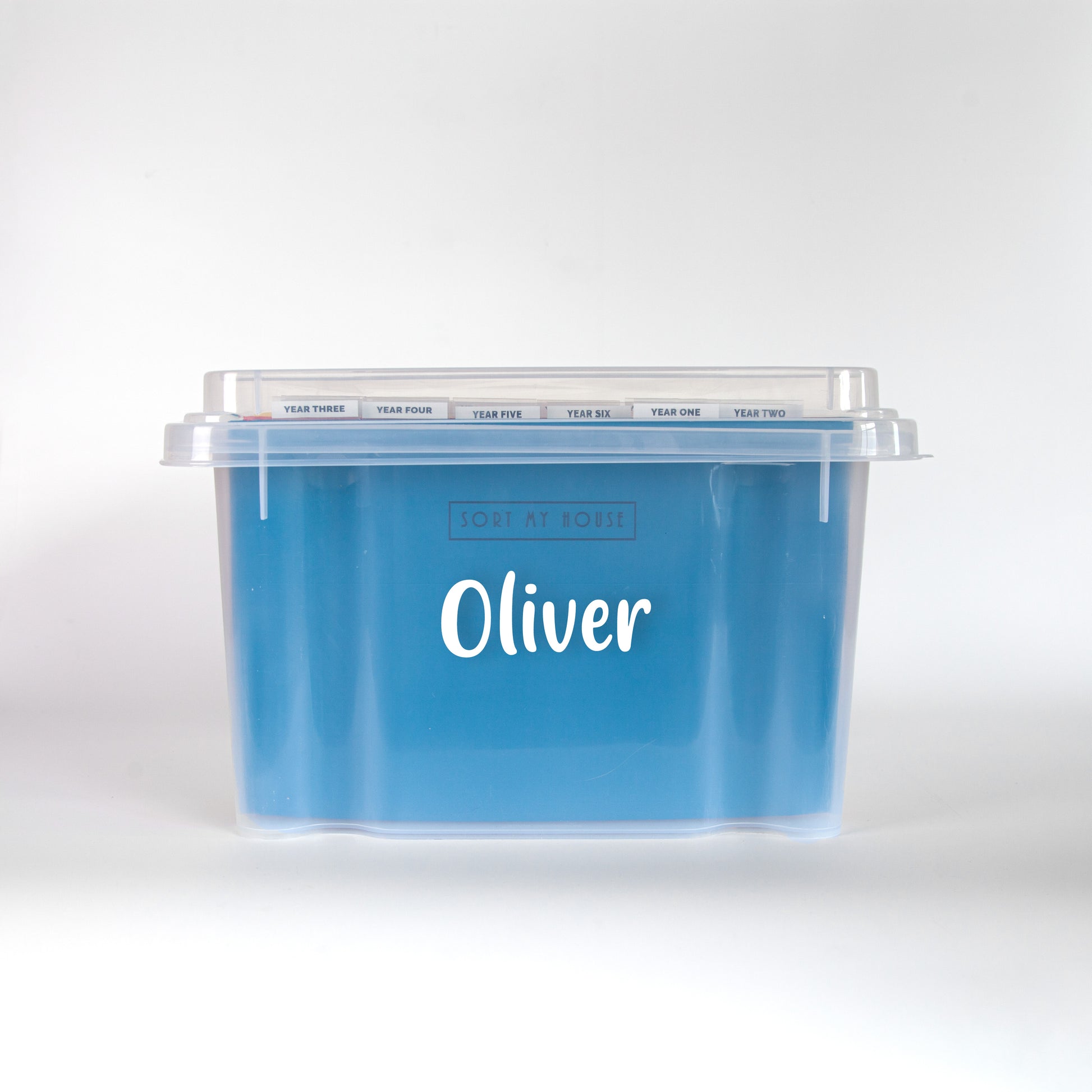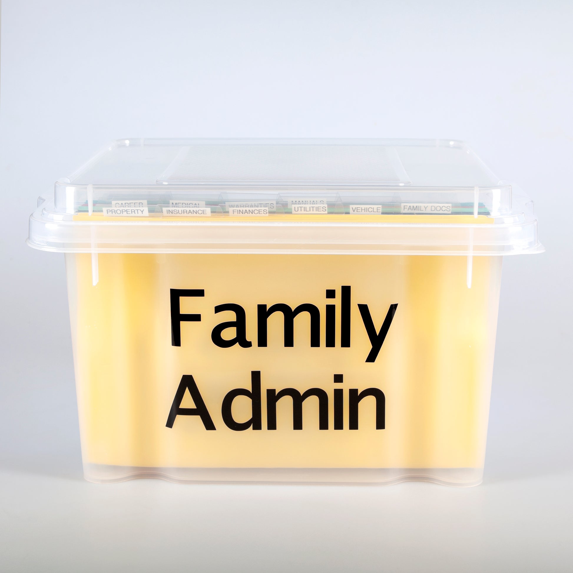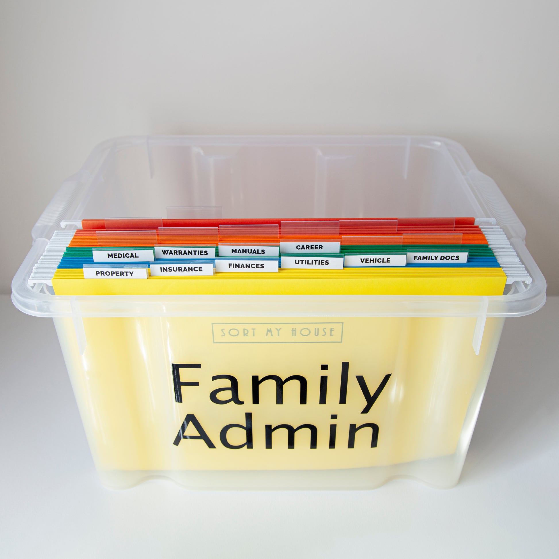 Each box comes with a personalised label such as 'Smith Family' or 'Home Admin'. There are 4 fonts and 4 colours to choose from.